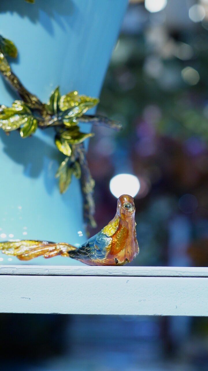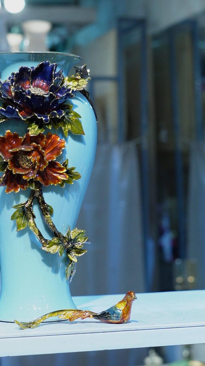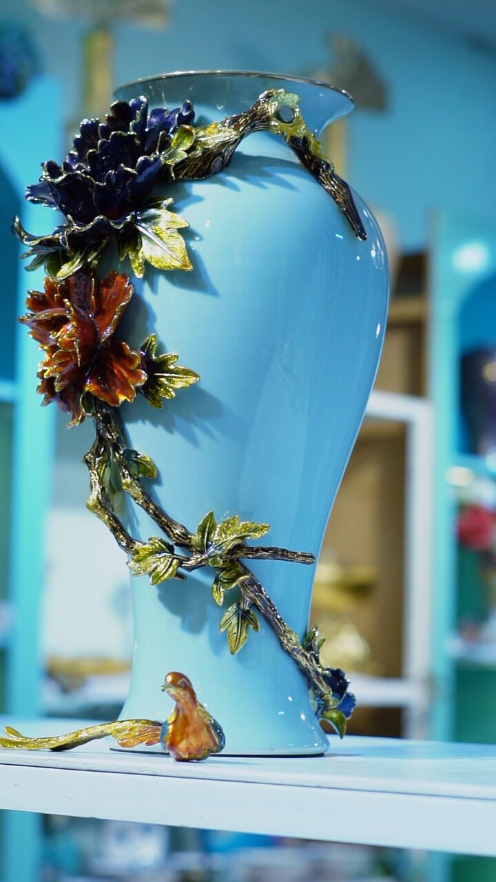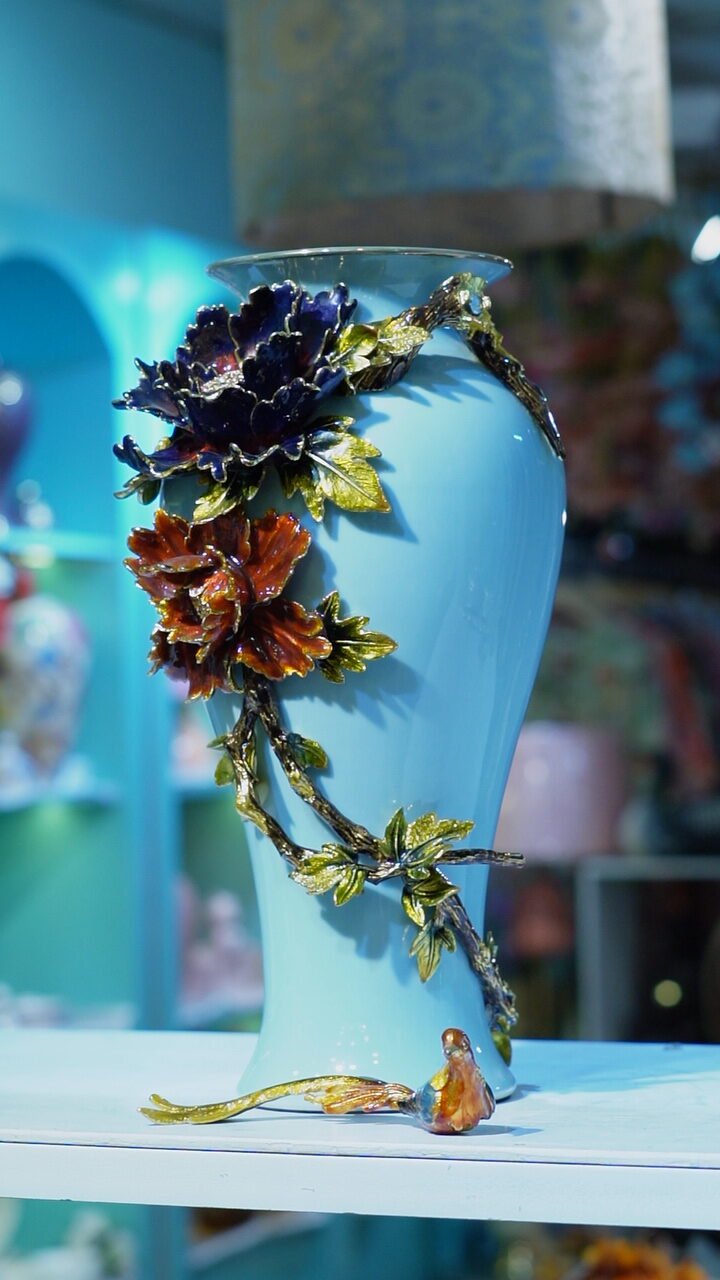 That’s a beautiful vase! The bright turquoise base is decorated with detailed, glossy floral embellishments — a deep blue flower near the top, a red-orange one below it, both accented with textured green leaves and stems. At the bottom, a small decorative bird is perched, adding charm and elegance.